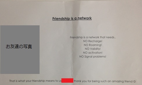 先日、J君が同じようにホームスクールをしているお友達から、プレゼントをもらいました。ぬいぐるみとお菓子だったのですが、何よりもJ君が喜んだのは、添えられていたメッセージでした。(主人はJ君から、壁に貼ってくれと頼まれたそうです)